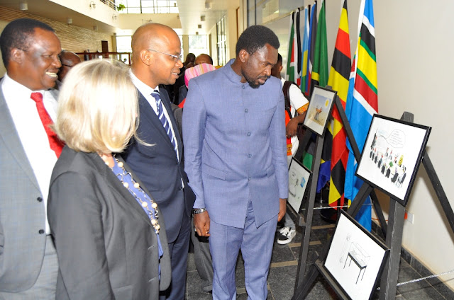 Waziri wa Maliasili na Utalii, Dk. Hamisi Kigwangalla (kulia) na Waziri wa Nchi Ofisi ya Makamu wa Rais, Muungano na Mazingira, January Makamba wakimsikiliza mmoja ya wachora katuni za kuhamasisha uhifadhi wa mazingira muda mfupi baada mkutano wa tano wa Baraza la Kisekta la Mawaziri wa Maliasili na Mazingira wa Nchi za Jumuiya ya Afrika ya Mashariki uliohitimishwa leo katika ukumbi wa EAC jijini Arusha. Mkutano huo ulilenga kujadili na kusaini makubaliano mbalimbali ya namna bora ya kusimamia sekta hizo katika nchi wanachama.