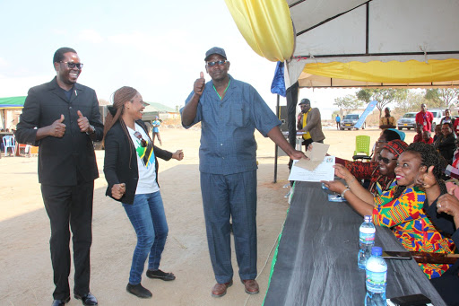 Mkuu wa Wilaya ya Chemba, Simon Odunga (kushoto) na Katibu Tawala wa Wilaya hiyo,Zahara Michuzi wakifurahia Mkulima kutoka wilaya hiyo, kupata cheti cha ushindi wa Mkulima Bora katika Maonesho hayo.