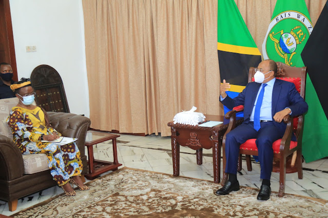 Rais wa Zanzibar na Mwenyekiti wa Baraza la Mapinduzi Dkt. Hussein Ali Mwinyi akizungumza na Uongozi wa Wizara ya Mambo ya Nje na Ushirikiano wa Afrika Mashariki Ikulu - Zanzibar. Uongozi huo unaongozwa na Waziri wa Mambo ya Nje Balozi Liberata Mulamula (Mb), Naibu Waziri, Balozi Mbarouk Nassor Mbarouk (Mb), Katibu Mkuu, Balozi Joseph Sokoine pamoja na Naibu Katibu Mkuu, Balozi Fatma Mohammed Rajab katika ziara rasmi ya kujitambulisha kwa Viongozi Waandamizi wa Serikali ya Mapinduzi Zanzibar.