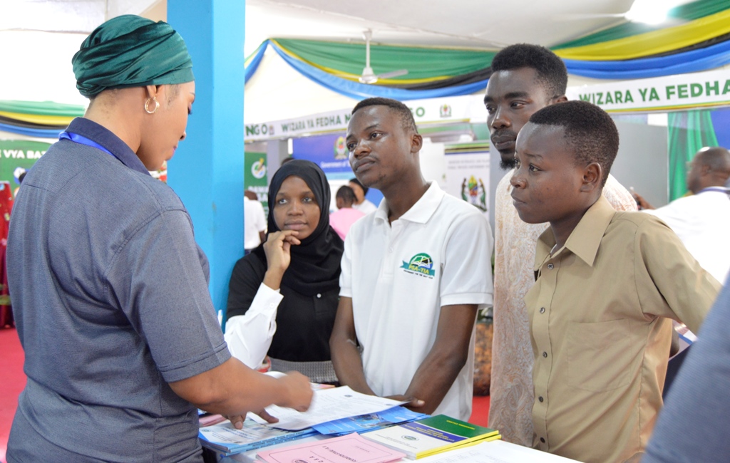 Meneja Masoko na Uhusiano kwa Umma wa Bodi ya Wataalamu wa Ununuzi na Ugavi (PSPTB), Bi. Shamim Mdee akitoa elimu kwa Viongozi wa Chama cha wanafunzi wanaosoma masomo ya Ugavi na Ununuzi(PSA-TIA) walipotembelea Banda la Bodi hiyo leo kwenye Maonesho ya 46 ya Kimataifa ya Biashara yanayofanyika katika Viwanja vya Mwalimu Nyerere jijini Dar es Salaam.