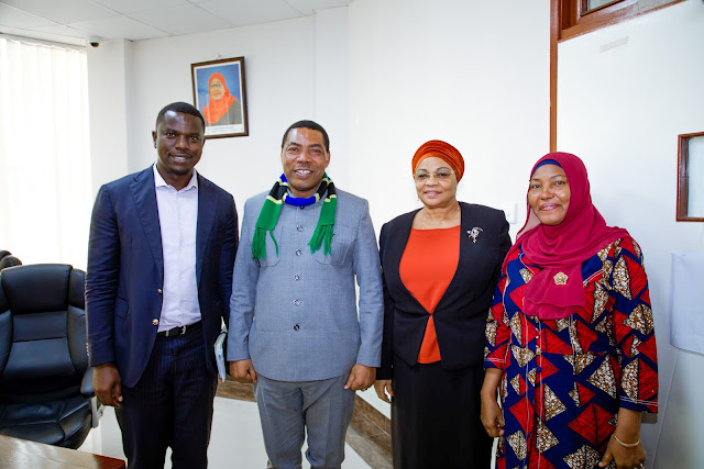 Waziri wa Fedha Mhe. Dkt. Mwigulu Lameck Nchemba (Mb) (wa pili kushoto), Waziri wa Ujenzi, Mhe. Innocent Bashungwa (Mb) (wa kwanza kushoto), Katibu Mkuu wa Wizara ya Fedha, Dkt. Natu El – maamry Mwamba (wa pili kulia) na Katibu Mkuu wa Wizara ya Ujenzi, Mhe. Balozi Mhandisi Aisha Amour, wakiwa katika picha ya pamoja, baada ya kumalizika kwa mkutano kati ya Mawaziri hao ulioangazia maendeleo ya Wizara ya Ujenzi, uliofanyika katika ukumbi wa Mikutano wa Waziri wa Fedha, jijini Dodoma.