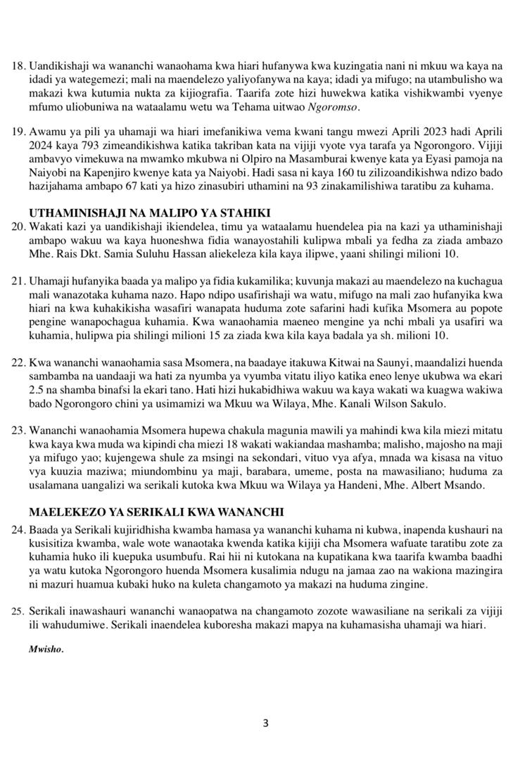 SERIKALI YAELEZA MAENDELEO YA MPANGO WA UHAMIAJI WA HIARI ENEO LA HIFADHI YA NGORONGORO KWENDA MSOMERA NA MAENEO MENGINE YA NCHI