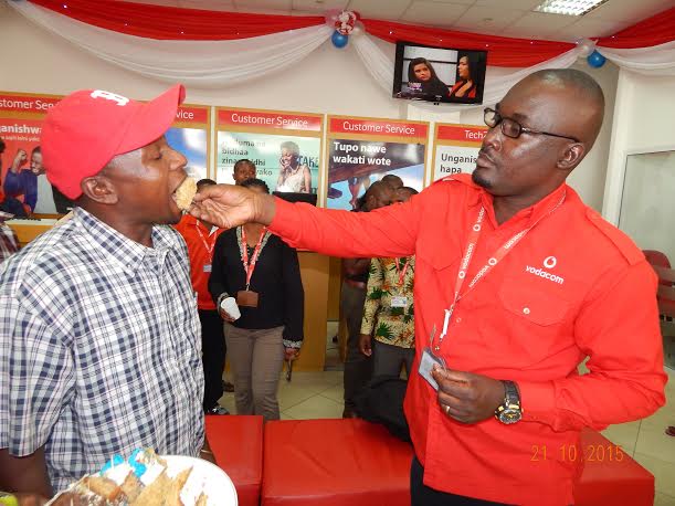 Mteja wa Vodacom Tanzania kanda ya ziwa,Farida Omar (kushoto)akilishwa keki na Mkuu wa Masoko na Mauzo wa kanda ya ziwa wa kampuni hiyo,Dominician Mkama(kulia)wakati wa uzinduzi wa duka la kampuni hiyo upya baada ya kukarabatiwa kwa muda ya miezi miwili jijini Mwanza.