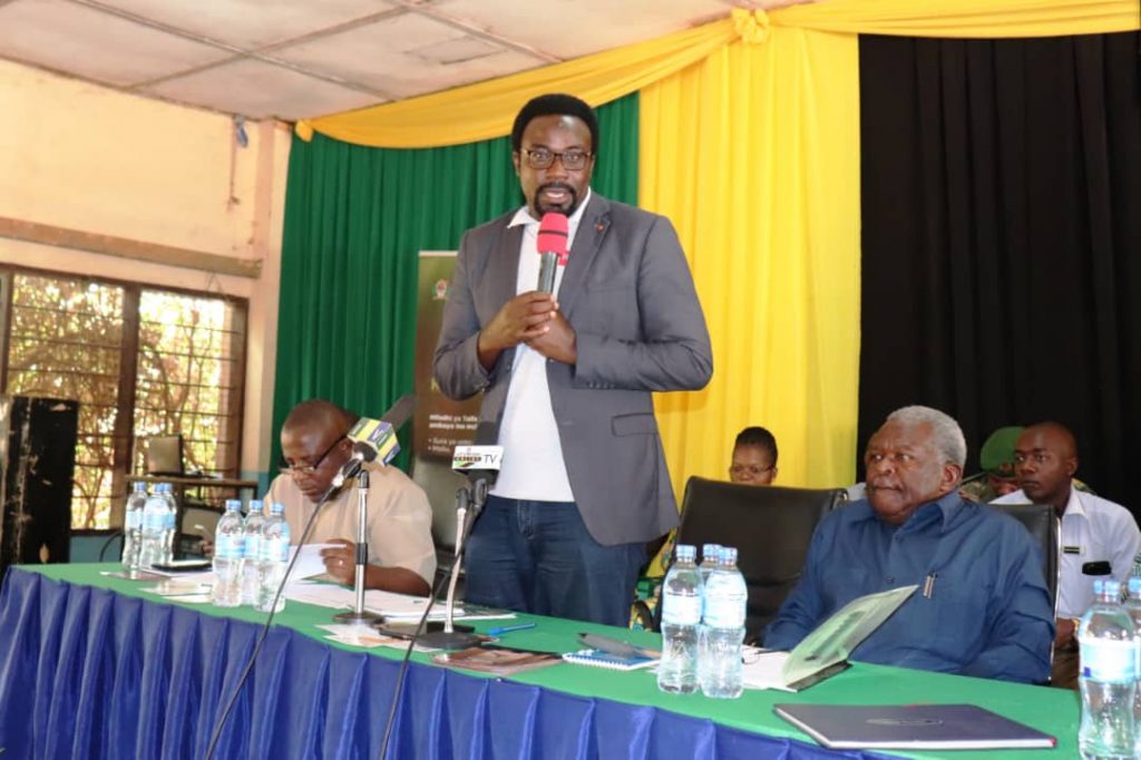 Mkuu wa Wilaya ya Tunduru, Mhe. Julius Mtatiro akimshukuru Waziri wa Nchi, Ofisi ya Rais, Menejimenti ya Utumishi wa Umma na Utawala Bora, Kapt. (Mst), Mhe. George H. Mkuchika (Mb) kwa kuitembelea wilaya yake na kufanya kikao kazi na watumishi wa wilaya hiyo jana kwa lengo la kuhimiza uwajibikaji.