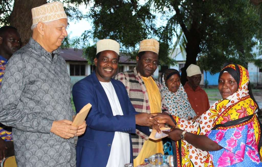 Mkuu wa Mkoa wa Kusini Unguja Ayoub Mohamed Mahmoud akiwakabidhi pesa Baadhi ya Wanavikundi vya Ujasiriamali vya kuweka na kukopa kutoka shehia ya Ng’anani na Kajegwa Makunduchi katika hafla iliyofanyika Skuli ya Msingi Kajegwa Makunduchi.