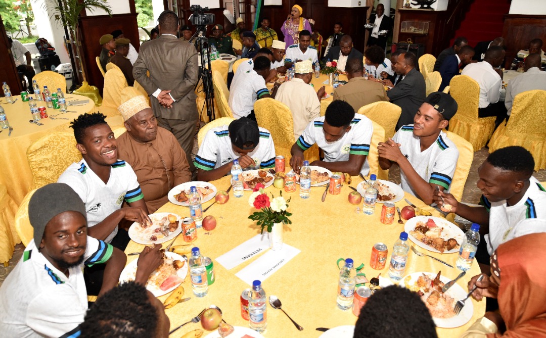 WACHEZAJI wa Timu ya Taifa ya Zanzibar Heroes wakijumuika na Rais wa Zanzibar na Mwenyekiti wa Baraza la Mapinduzi.Mhe.Dk.