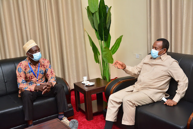 Makamu wa Kwanza wa Rais wa Zaanzibar, Mhe. Othman Masoud Othman ( kulia) akizungumza na Mwenyekiti wa Chama cha Mabaharia Zanzibar Bw. Hamza Ussi Ame. Mazungumzo hayo yamefanyika ofisini kwa Makamu wa Rais Migombani leo mjini Zanzibar